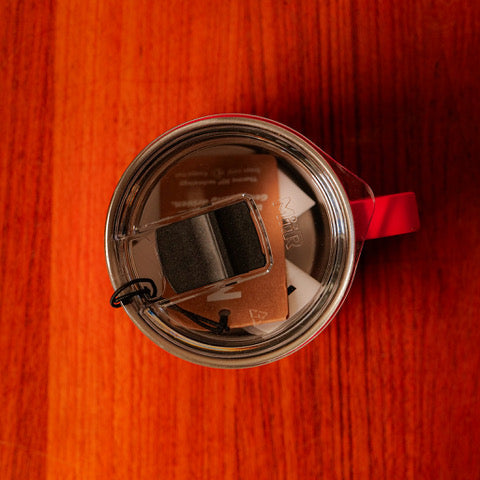 On the lid, a sliding part to keep warm (or cool!) and not get it everywhere!